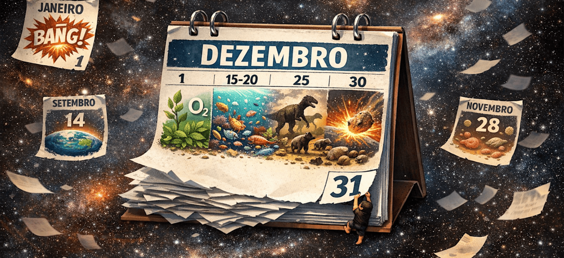 Para nós, o ritmo só muda de verdade em setembro. No dia 14, a Terra se forma a partir de gás e poeira interestelar. Poucos dias depois, em 25 de setembro, a vida surge, ainda tímida, em nível molecular, nos oceanos primitivos do nosso planeta. Novembro e dezembro trazem uma aceleração impressionante. Em 28 de novembro, como se aproveitasse uma Black Friday cósmica, surgem os primeiros organismos multicelulares. No dia 1º de dezembro, plantas verdes começam a liberar oxigênio, transformando nossa atmosfera. Entre os dias 15 e 20, ocorre a Explosão Cambriana. Trilobitas, peixes, vida complexa explodindo em diversidade. Logo depois, as plantas começam a colonizar a terra firme. No dia 25 de dezembro, a Terra ganha um presente de Natal: os dinossauros. Eles dominam o planeta por alguns dias até receberem um presentinho espacial e desaparecerem em 30 de dezembro, abrindo espaço para os mamíferos e, mais tarde, para as aves.