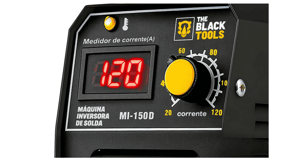 O modelo possui corrente máxima de 120 amperes (120A), permitindo realizar soldagens em diferentes tipos de peças metálicas conforme o eletrodo utilizado. O ajuste da corrente é realizado diretamente no equipamento, permitindo adaptar a intensidade conforme o tipo de material e eletrodo.