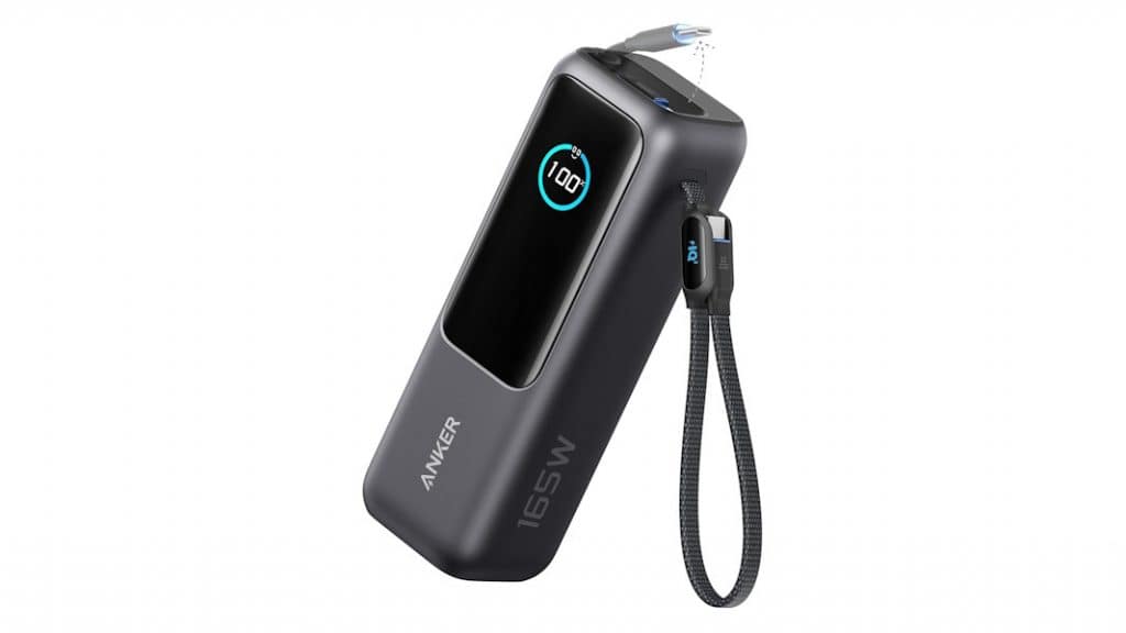 O carregador da Anker tem capacidade de 25.000 mAh e entrega até 165 W de potência total. Ele vem com três entradas, sendo duas USB-C e uma USB-A, o que permite carregar três aparelhos ao mesmo tempo.
